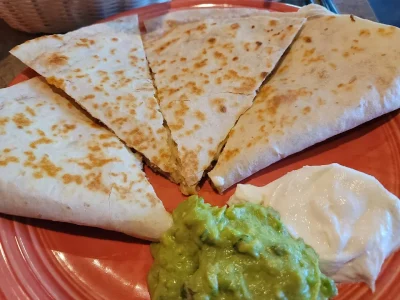 Tomatoes, grilled onions, red and green bell peppers with melted Monterey jack cheese; served with sour cream and guacamole.