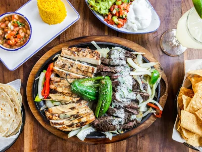 Comes with chicken, steak and shrimp, prepared with onions, green and red peppers; served with pico de gallo on black beans, rice, guacamole, sour cream and tortillas.